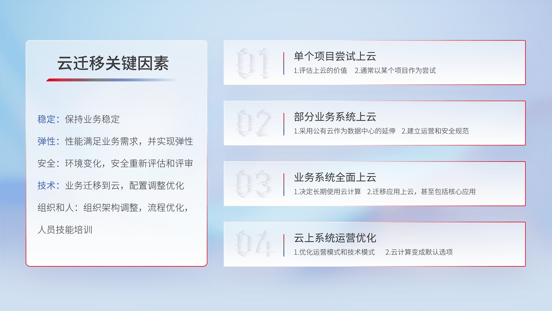 结合实际业务,,从规划设计、、云平台选型、、、云原生改造、、数据迁移、、集成交付,,迁移全过程为客户识别最佳上云路径,,,,做好风险识别管理,,,设计网络架构、、身份权限、、、、安全审计合规、、、操作审计、、日志审计、、、、监控告警策略、、多站点容灾设计等,,对云上基础设施进行整体规划,,提升IT治理水平,,,,以满足弹性、、、、高可用、、高性能的需求。。