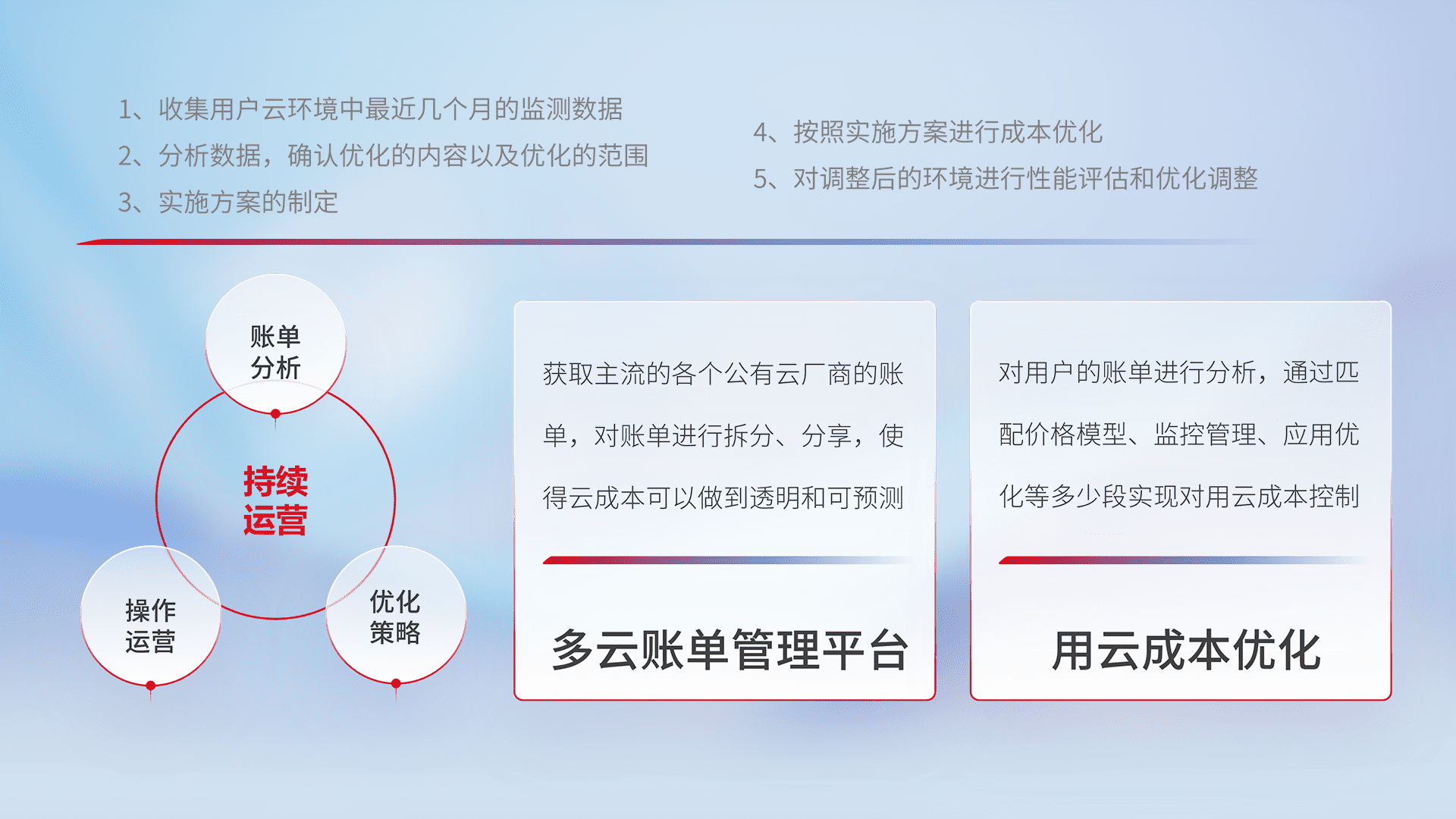 通过多云纳管,,,以统一的资源数据模型把客户的云资源进行抽象和封装,,,进而实现对多云资源的统一操作,,,保障云资源管理的可靠性、、稳定性与可用性。。。量身定制化运维内容,,配置、、开发运维、、、补丁管理、、、、备份、、监控、、、、认证和访问管理、、、、审计和日常巡检等,,,保障在用云过程中的可靠度,,,,稳定度以及高可用率。。。。